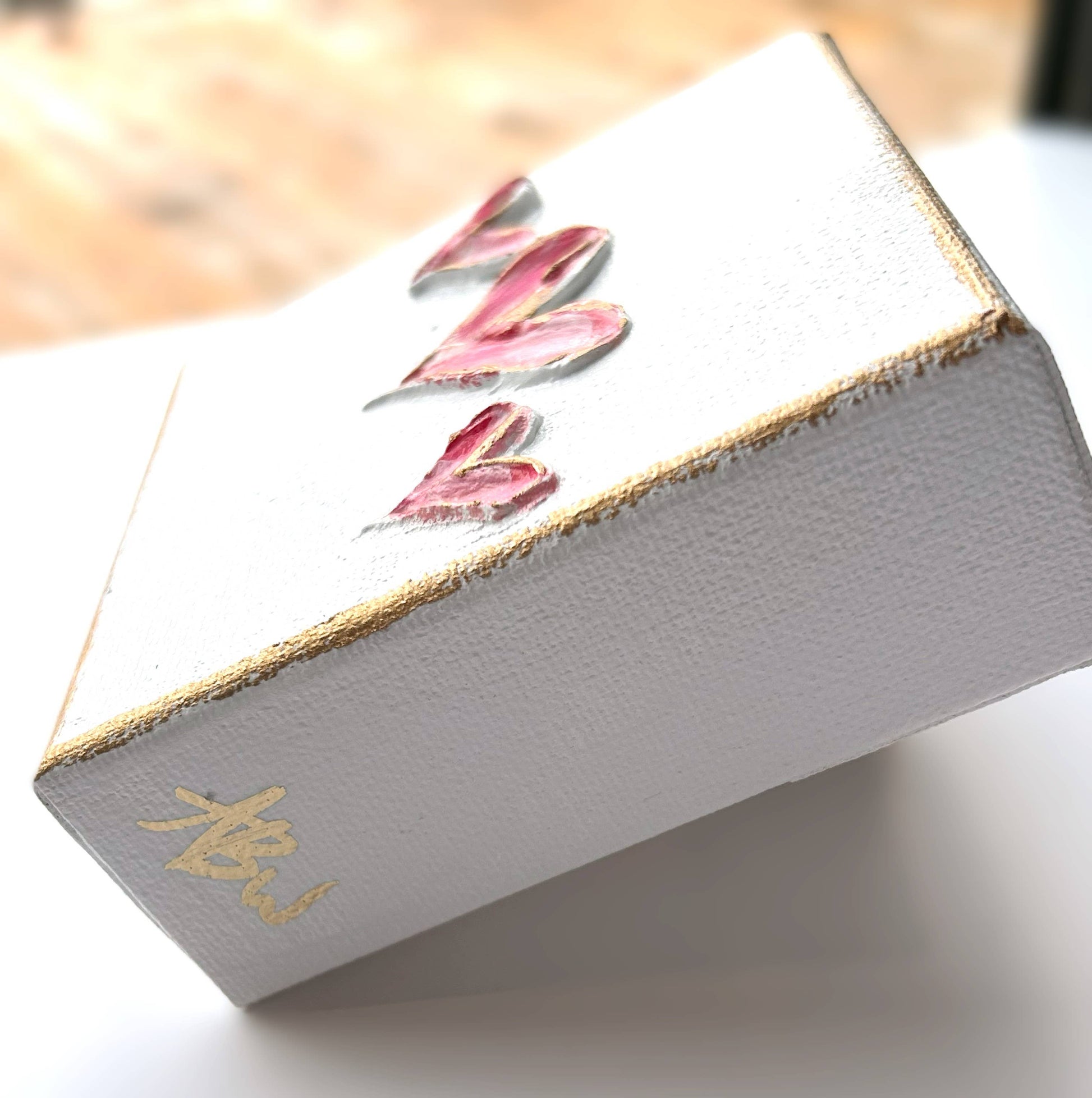 Hand painted and textured on a 4x4-inch gallery canvas (1-3/8" thick frame), this precious trio of hearts is beautifully crafted to be a special gift for someone you love.