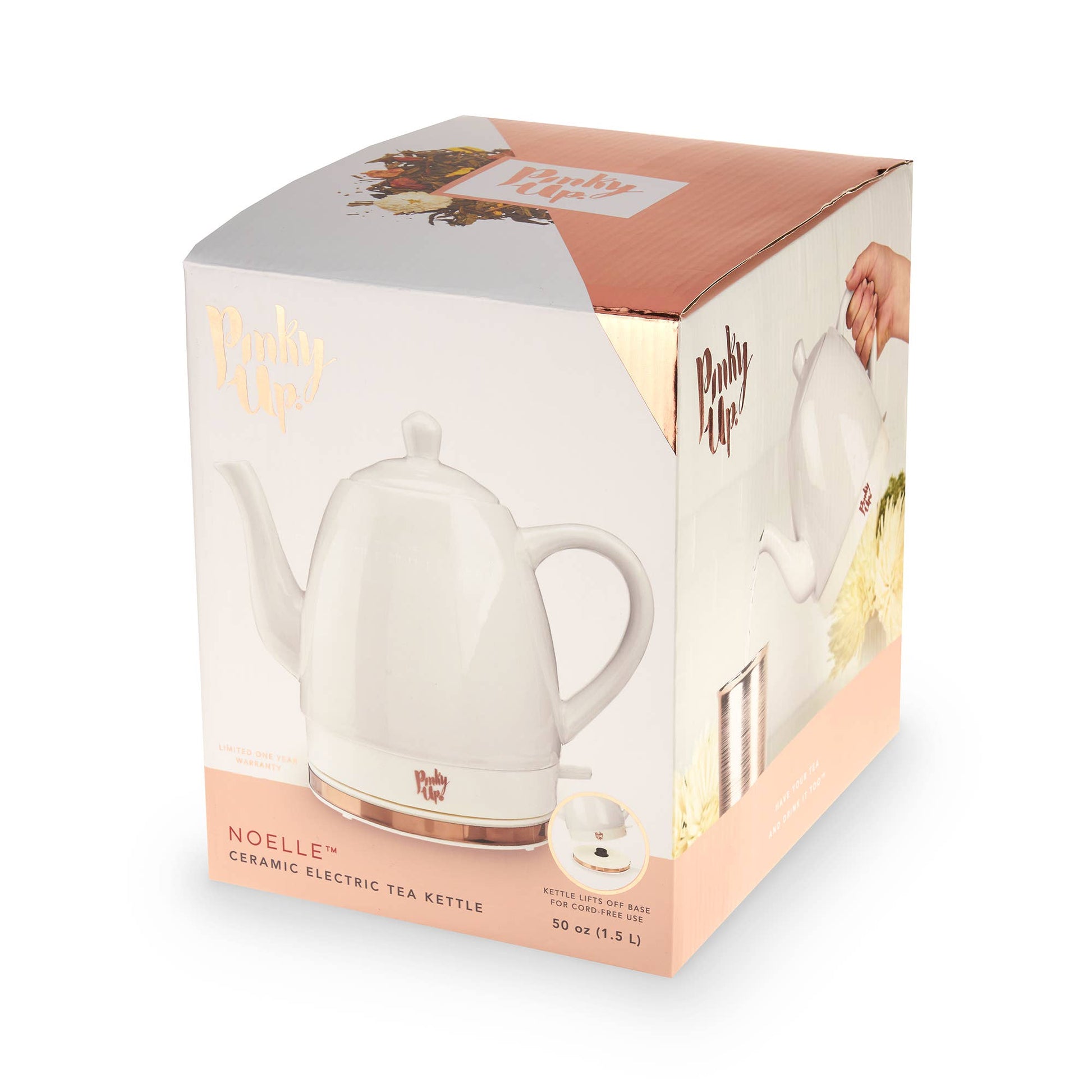 Fashion meets function with this stylish tea kettle. The Noelle Ceramic Electric Tea Kettle features glossy pale gray ceramic glazing and a trendy rose gold metallic base. Includes a plug-in base, 1.5 L capacity, and an easy on/off switch.