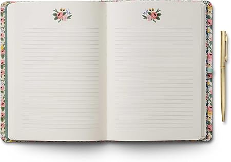 Designed for note takers and journal-ers, this hardcover journal comes with a gold pen with black ink, and features 144 ruled pages, an elastic band, and a pocket for extra storage.