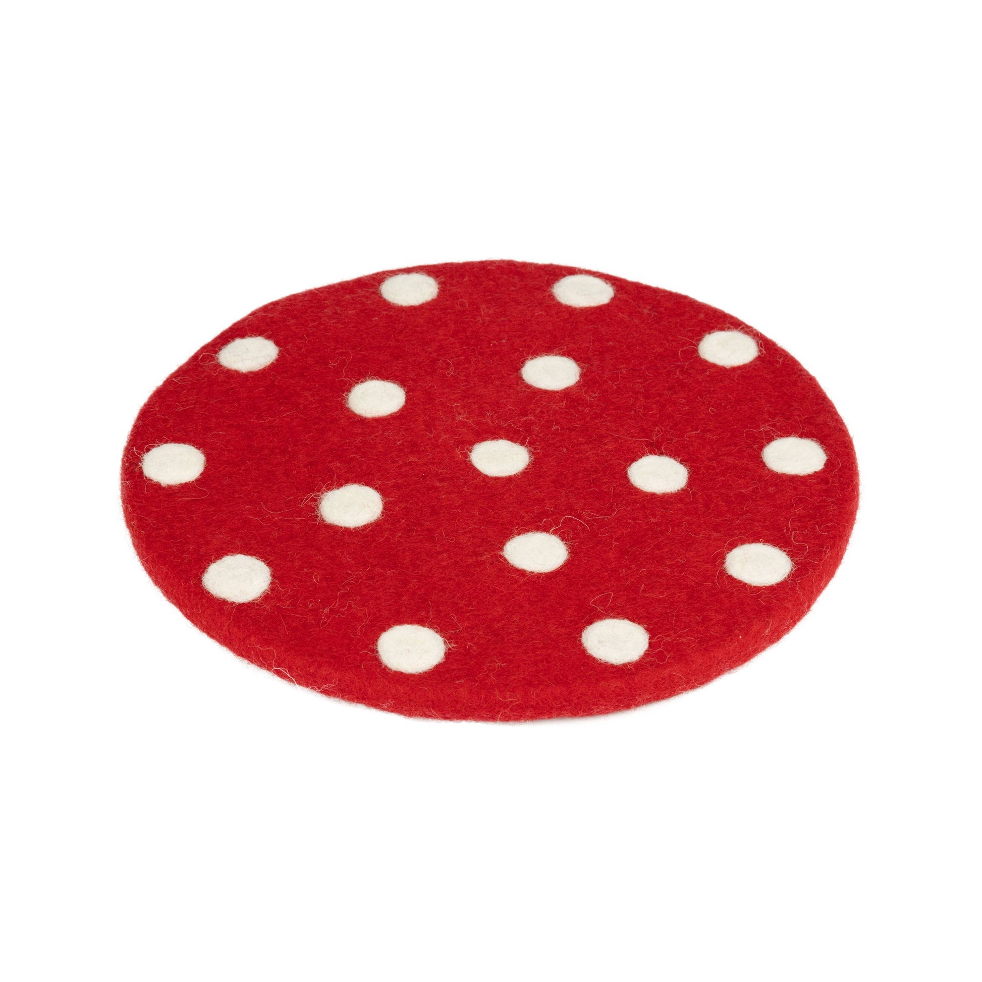 Felt trivet in red with white polka dots, 8.25 in. Please note that due to the nature of the materials,slight color variations may occur between individual items and compared to images. These differences are minimal and do not affect the overall appearance.